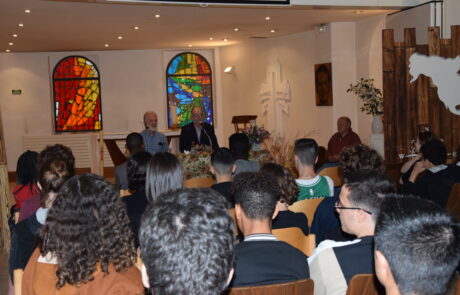 Comment va-t-on le saluer ? La perspective d’une rencontre avec le Père Michael fait naturellement surgir une appréhension. Ses crochets métalliques au bout des bras rendent le geste délicat… Toute gêne disparue et est vite balayée par les premiers moments de sa présence dans notre maison. Les 150 élèves viennent écouter son histoire. Le Père Michael dit : « (…) Je voudrais vous inviter à venir me rendre visite au Cap en Afrique du Sud. Vous êtes prêts à venir ? Et lorsque vous arriverez au Cap, vous serez très surpris car on vous emmènera à la maison Don Bosco. Et donc comme ça, vous serez surpris de voir que même au Cap vous serez chez vous. Et merci à mon frère Raphaël de nous avoir rappelé les 3 paroles principales de Don Bosco qui se résume en CROIRE, AIMER, ESPERER.